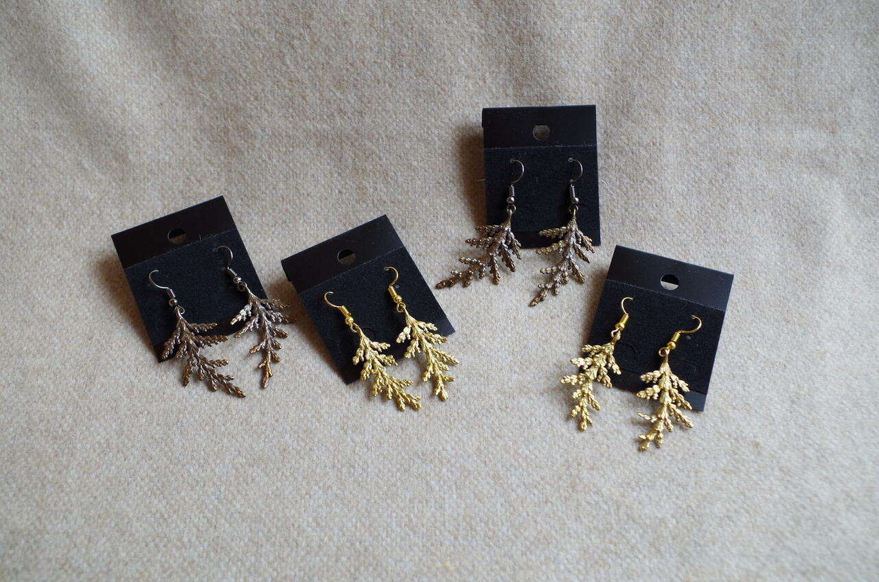 Kõrvarõngad on valmistatud messingust ning kuldsed ja mustad konksud on niklivabad. Kõrvarõngaid saab tellida kahes viimistlustoonis- kuldsed ning pruunikad.