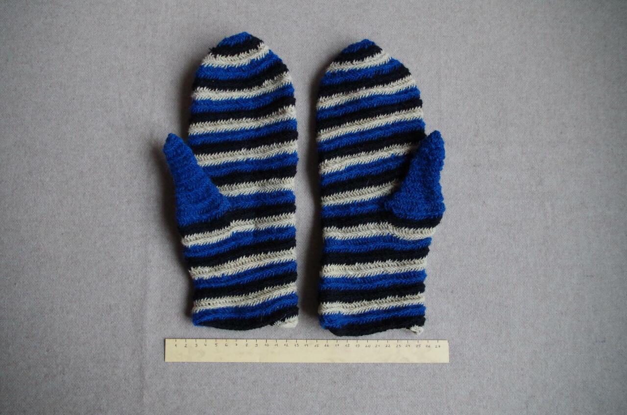 Sinimustvalged 100% villasest lõngast valmistatud nõeltehnikas kindad sobivad pigem suure käega meesterahvale.
