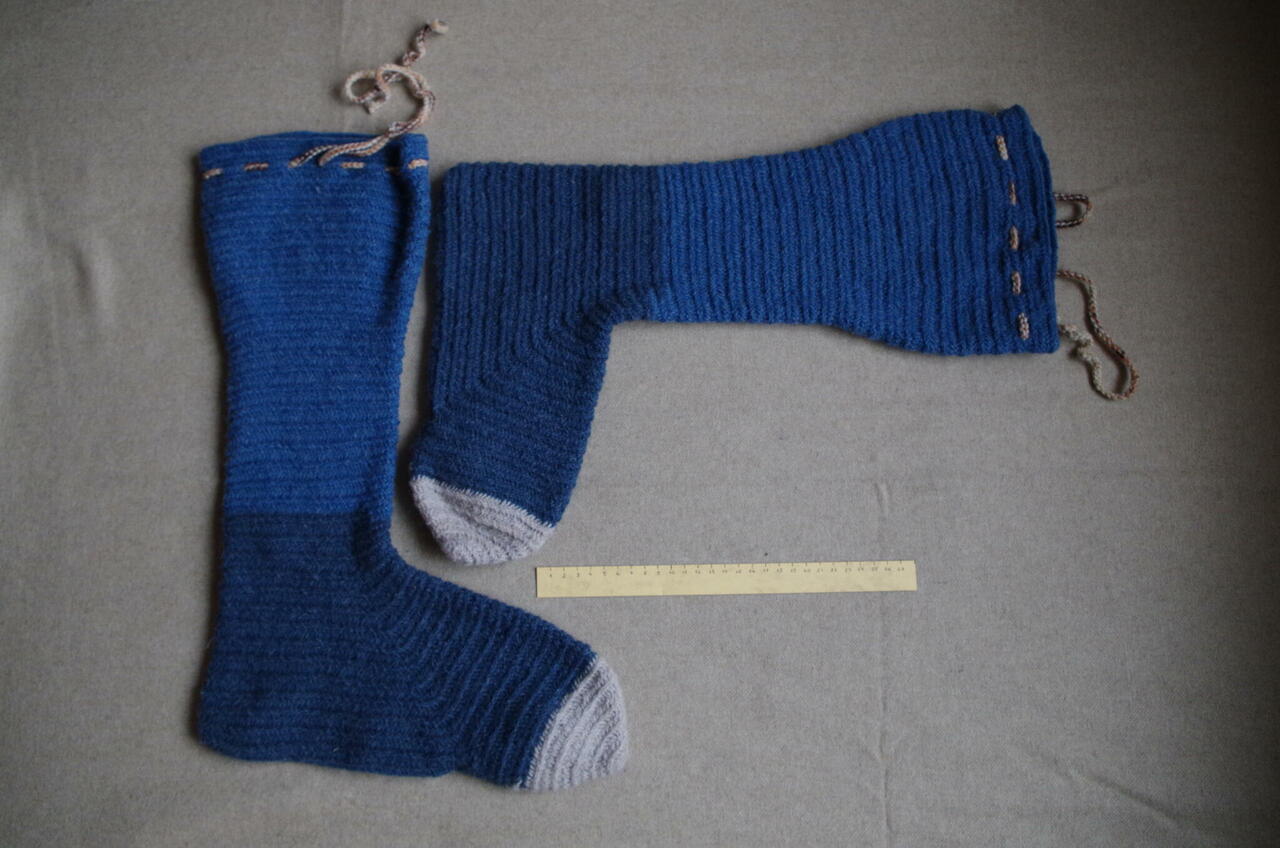 Pikad heledama sinise, tumedama sinise ja halliga 100% lambavillasest lõngast nõeltehnikas tehtud sokid sobivad jalale suuruses 45-46.