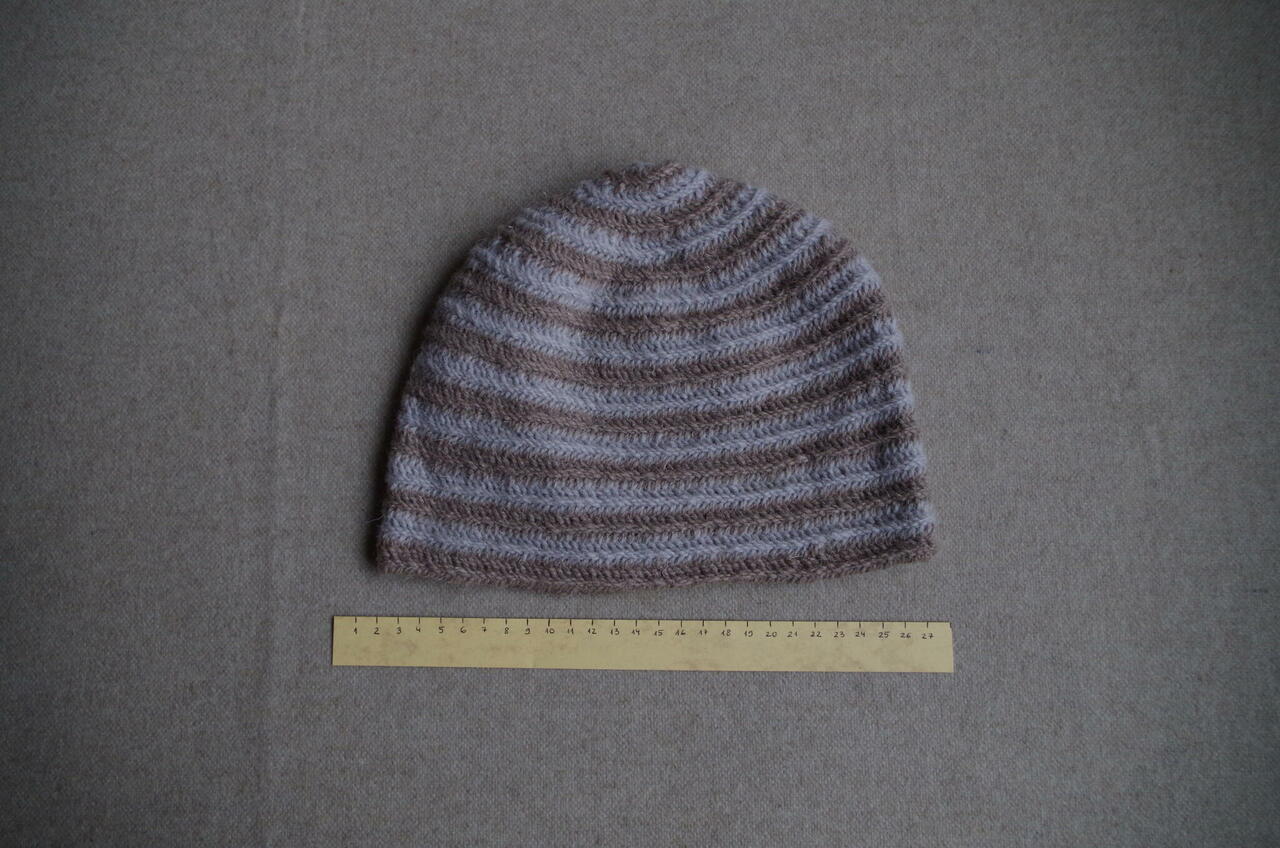Halli ja pruuni 100% lambavillasest lõngast nõeltehnikas valmistatud müts sobib u 56-57 cm peaümbermõõdule. Müts istub sügavalt peas ning on ilma voodrita.